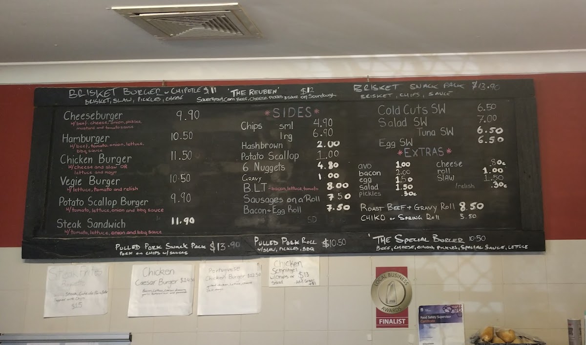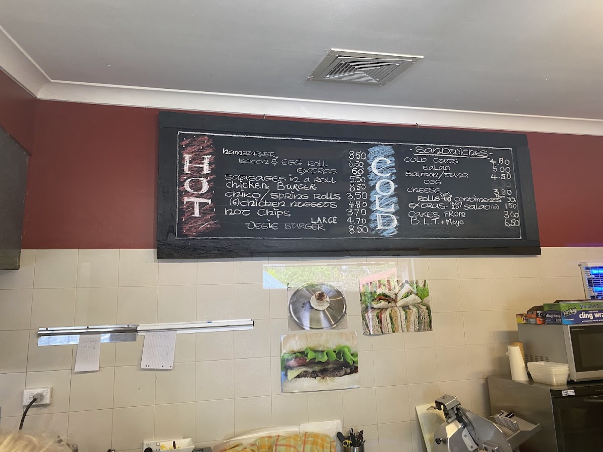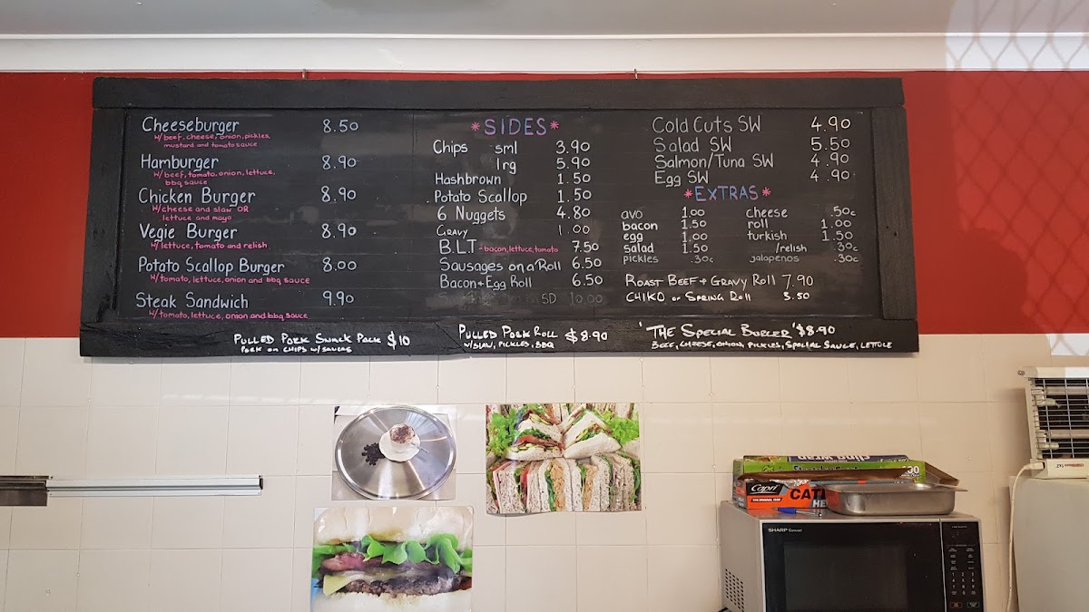 This menu offers a range of classic Australian takeout items suitable for quick meals throughout the day. It is structured primarily around burgers, sandwiches, and light snacks, catering to customers seeking convenient, casual food options.